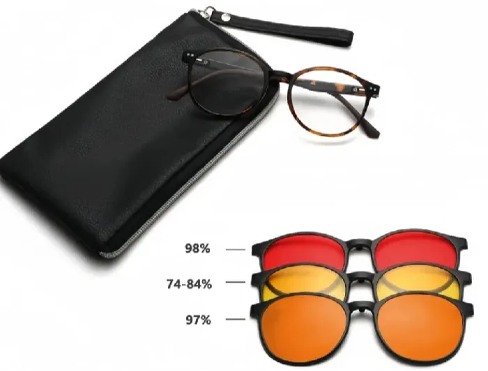 Tu armazón para tus gafas graduadas mas 3 clipones de protección de luz azul. Amarillo para la mañana, naranja para la tarde y rojo para la noche cuando te vas a dormir y miras tu celular. La luz azul es más perjudicial de lo que crees. ¡Protégete!